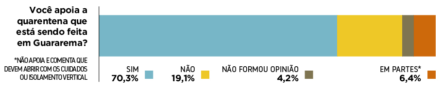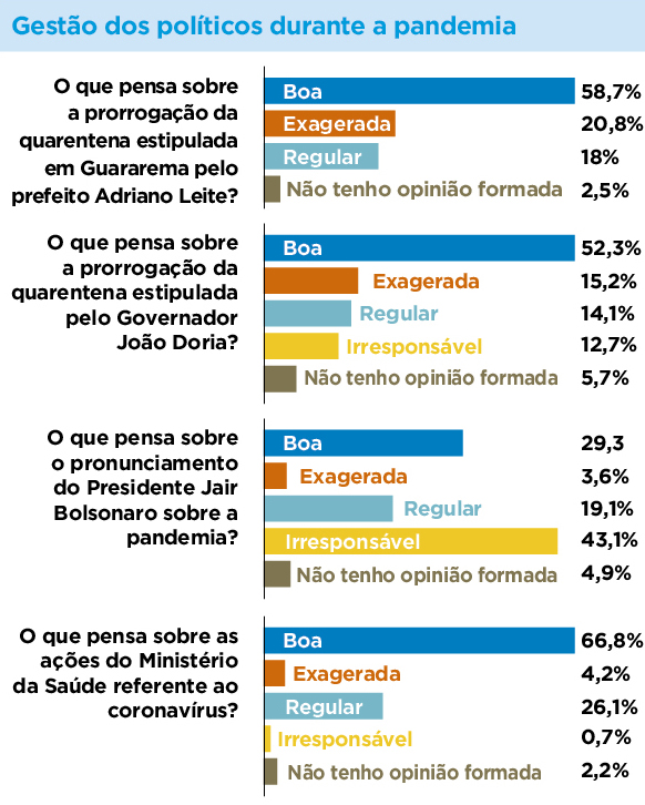 Outro dado importante é o apoio do decreto de quarentena da cidade, que é aprovado por 70,3% dos participantes, os números de aprovação também continuam altos nos tópicos da prorrogação da quarentena em Guararema (58,7%) e no Estado de São Paulo pelo governador João Doria (52,3%), além das ações do Ministério da Saúde (66,8%).