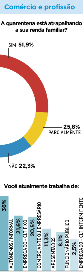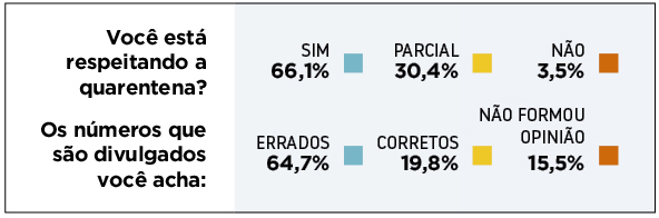 Já quanto o pronunciamento do presidente Jair Bolsonaro, que pede pelo fim da quarentena, 19,1% acha regular, 29,3% acha bom e 43,1% acha irresponsável, o restante das respostas é de pessoas que não tem opinião formada sobre o assunto e outras que acham o ato um exagero. A desconfiança continua na divulgação dos números de casos, que é apontada por 64,7% das pessoas como errada.
