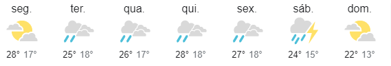 Segundo a previsão do tempo, o município deve enfrentar o tempo chuvoso de terça-feira (18) até sábado (22), com a possibilidade de tempestades isoladas com quedas de raio.